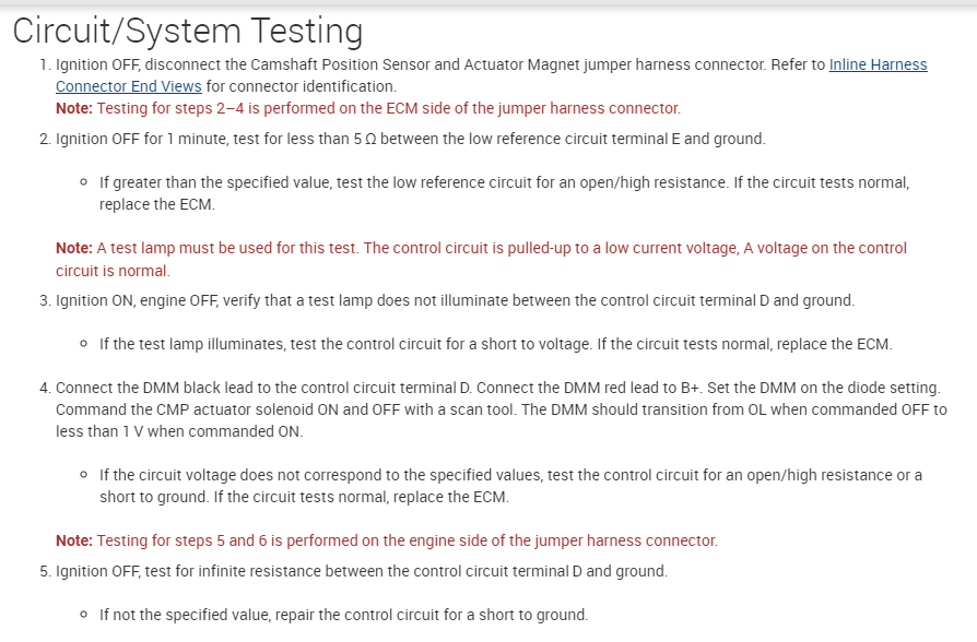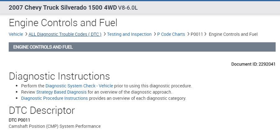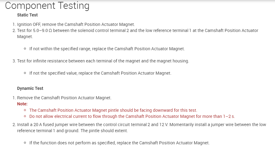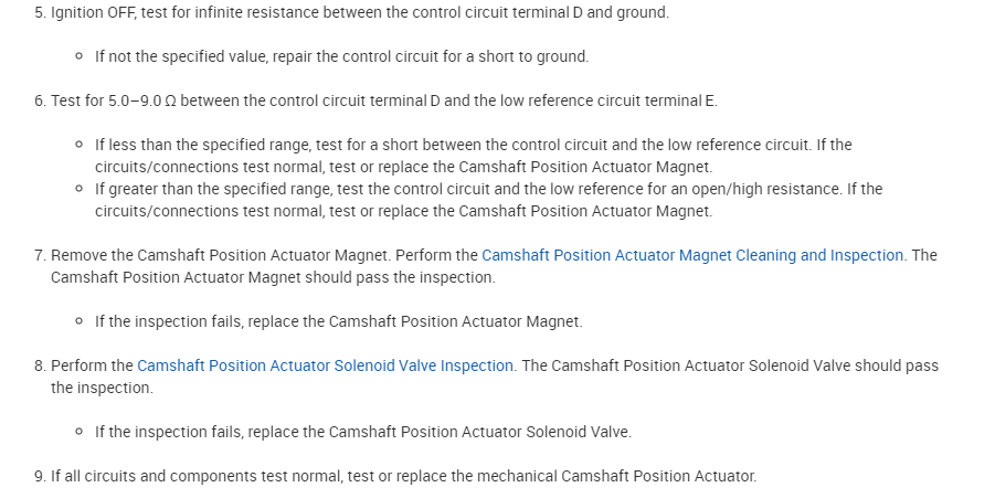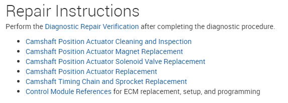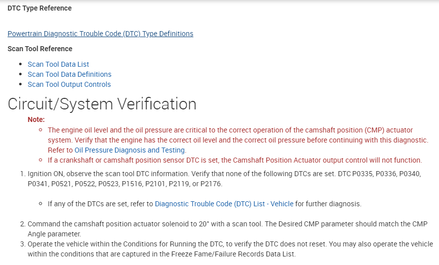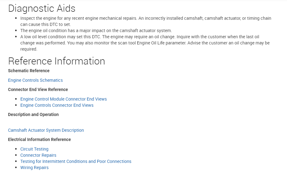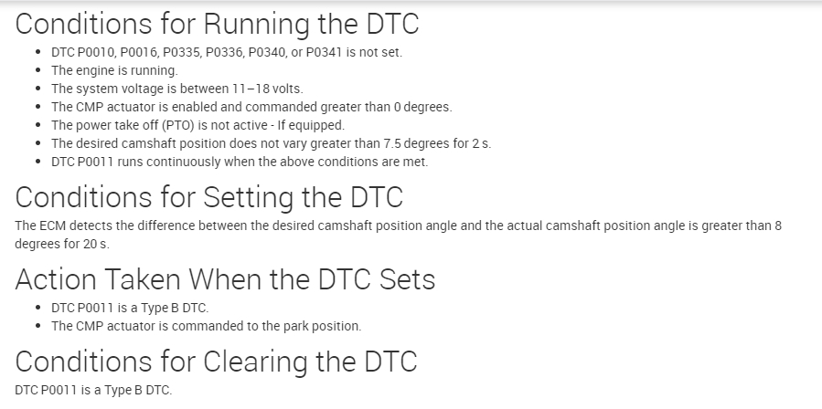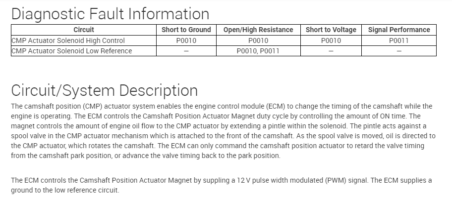 I'm going to attach the definition and diagnostics for the code. Testing needs to be done to determine if the cam actuator is responding. It could simply need to be cleaned, but even that isn't simple because to remove it requires the timing chain to be removed.