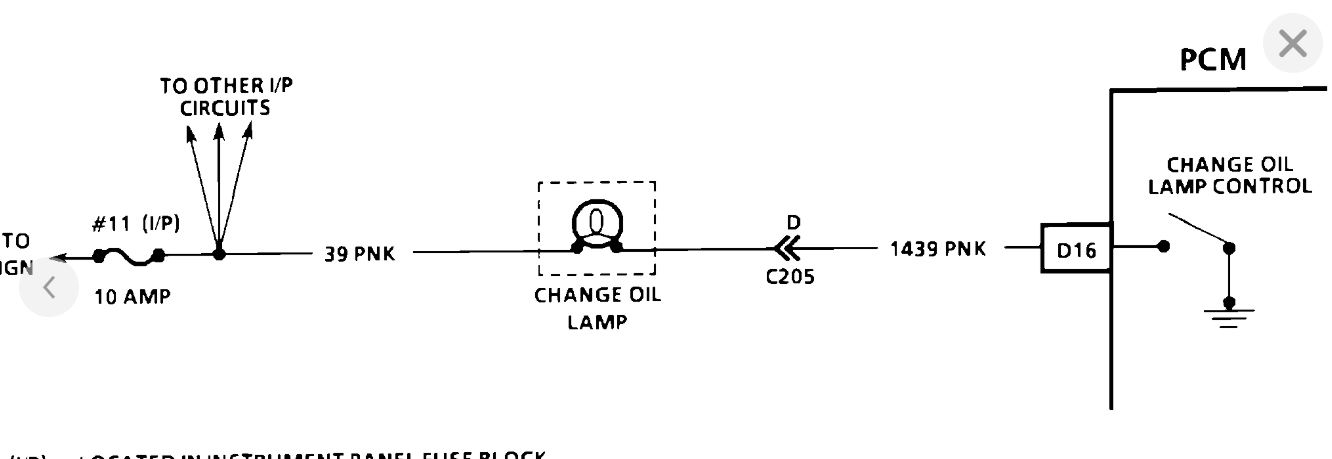 Ignition voltage is supplied directly to the change oil lamp on CKT 39. The Powertrain Control Module (PCM) controls the lamp by providing the ground path through CKT 1439.