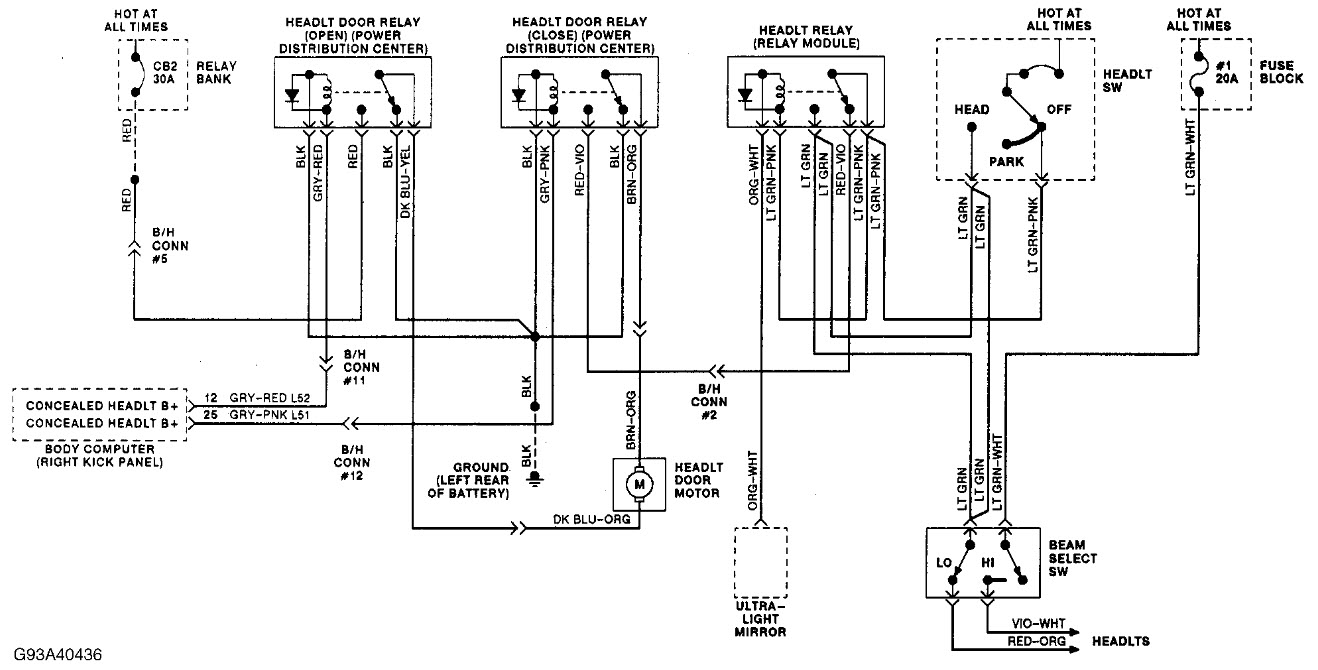 I'm sending teh schematic for auto headlight doors, check the close relay in the power dist
