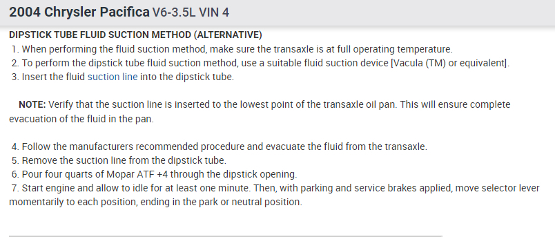 When you do a drain and fill, you should need about 4 QT of ATF+4 transmission fluid.