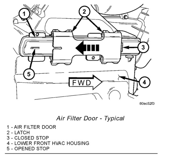 With the latch still positioned against its opened stop, install the air filter door onto the lower HVAC housing air filter opening.