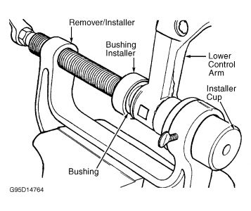 1.Position NEW ball joint housing into lower control arm bore with clamp bolt notch facing front bushing. Position ball joint and control arm in press with Receiving Cup (6908-2) supporting control arm. Position Remover/Installer (6804) over ball joint stud and against bottom body of ball joint. Align and press ball joint until ball joint is fully seated against bottom of control arm bore. 2.Position NEW seal over stud and housing as far as possible. Position Receiving Cup (6758) over seal boot, and press seal by hand squarely onto joint housing until seal seats against control arm.