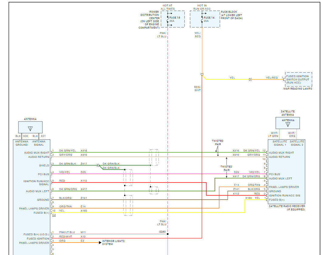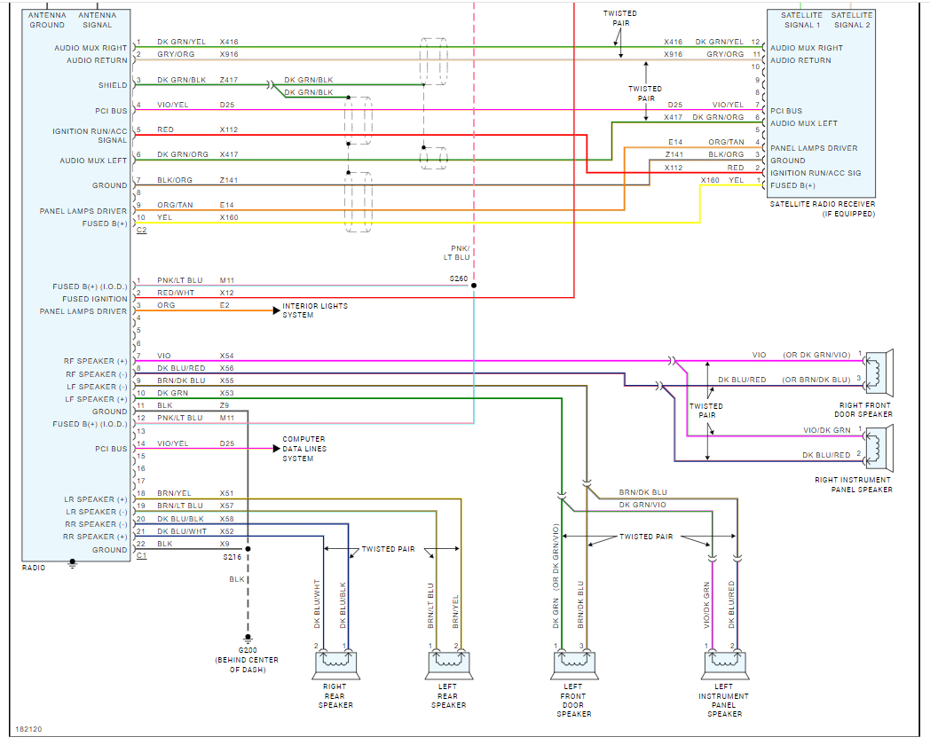 I have a Chrysler PT Cruiser, 2004, 25,000 miles and am replacing with new speakers. Now on the back of the radio head, their is all the wires bundled together and locked in this plastic clip. I have llooked at the speaker wire from the door and the colors are blue with brown and the other wire is green with purple. I looked at the back of the radio and somewhere along the line, the speaker wires changed colors and now I have two wires in the back of the radio that are both blue and brown. Is their a diagram or picture that could help me determine what the correct wires are on the back of the radio for the speakers?