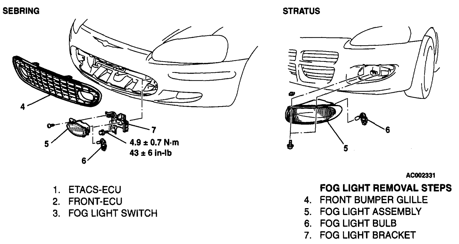 Here is how to replace the fog light for your 2001 CHRYSLER SEBRING. Check out the images (below). Let us know if you need anything else.