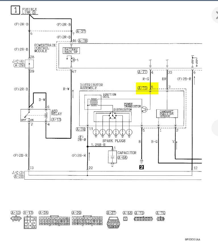 Hi Ken, I tested for spark after I pulled battery negative and checked resistances to most of the sensors for obvious shorts or open circuits (via the lifted PCM connectors), only the pin 6 line from the PCM connector to the ASD relay was questionable at 2.5 ohms (this also goes to the Generator, Distributor, and to fuse 1 of the PDC. Then I set up to test spark on the no. 6 plug, Wife assist mode with instructions "shut down immediately if engine starts". Of course it did, so I put it all back together and wonder what the next step should be. Seems to be triggered when the car sits for more than a couple days but doesn't seem to be a battery issue as I put a full charge on the battery overnight before attempting to start it, also pulled B+, none of which worked. Has anyone published a list of resistance values for the sensors on this car? I know when the Hall effect crank sensor went bad, I was able to rig up a circuit with my scope, B+ and ground, sensor output, a piece of ferrous metal, and passed it back and forth past the metal and could see the output on the scope. Thanks