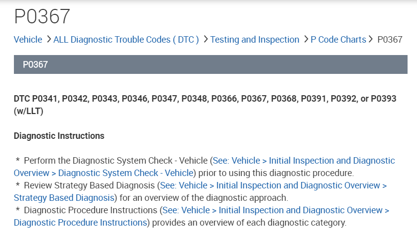 Your vehicle is not in either one of our databases, but the Direct Trouble Code (DTC) P0367 is a generic code, meaning it applies to all vehicle's the have a camshaft actuator made after 1996. DTC's have a letter P=Power-train, B=Body, C=Chassis, U=Information Network, The first number if even(0 or 2) is a Standard of Automotive Excellence(SAE) or generic code which applies to all vehicles, if odd(1 or 3) than it's a manufacturer code, specific to your vehicle. The second number is the system affected, and the last two numbers apply to the subsystem in that system that is affected. So I pulled this DTC troubleshooting from a Cadillac vehicle, but the principal's will be the same. I have included a diagnostic troubleshooting guide in the diagrams down below for you. Please get back to us with what you are able to find out.