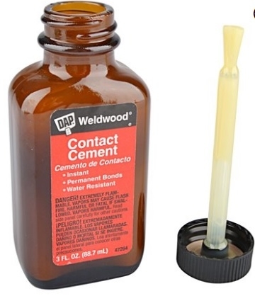 We will use contact cement. See my pic below. I get this a Wal-Mart in the hardware section, usually hidden on the bottom right side of the shelf. Hardware stores have it too. It's yellowish in color and somewhat stringy.