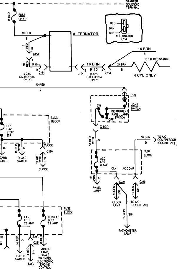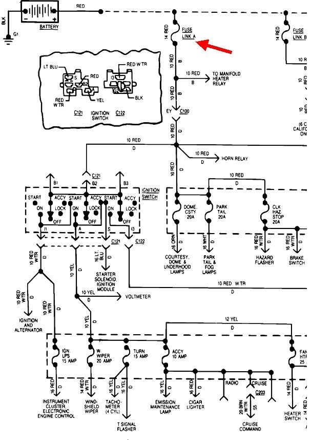 After looking at the diagram, it appears you are likely to find everything okay up to this point. If that is the case, the best suspect is fuse link "A" pointed out by my red arrow in the diagram. That feeds the horn, ignition switch, and most of the lights. It is not shown as being inside a fuse box like all the other fuses, so this is most likely going to be a fuse link wire. It's shown as a 14-gauge wire feeding a fatter 10-gauge wire that goes to all the other circuits. That makes the fuse link the weak link in the chain. I can't find a drawing that shows the link's location, but chances are it comes right off the battery's positive cable. Fuse link wires have a dull color that denotes their current rating. They're meant to be a slow-acting fuse. When it burns open, the insulation is designed to not burn or melt. To test one, just tug lightly on it. If it acts like a wire, it's okay. If it's burned open, it will act like a rubber band.