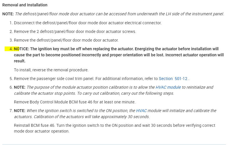 Hello gentlemen, I'm having a heck of a time figuring out why the climate control will not switch the air coming out to any other vents. It is stuck in one position. I have replaced the climate control module, to no avail, nothing changed. All lights work and air temp blends correctly, still does not switch vents, even though it lights up to reflect the mode change. I have looked at the actuator, attempted to replace it, removed the old one, plugged in new one, turned on ignition and the actuator pin did not rotate.