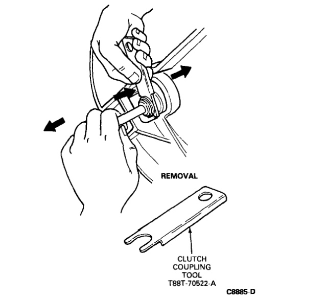 1. Using coupling disconnect tool No. T88T-70522-A or equivalent, disconnect hydraulic coupling at transmission by sliding white plastic sleeve toward clutch slave cylinder while tugging on tube.
