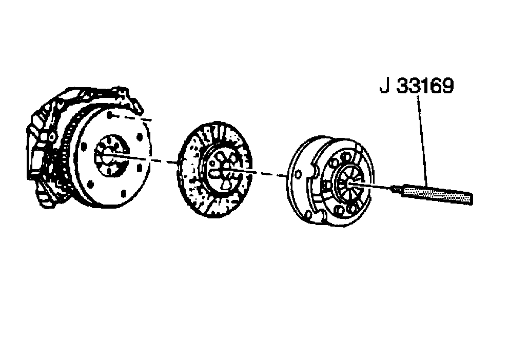 4. Install J 33169 through the cover plate, pressure plate, and into the flywheel for support during plate removal.
