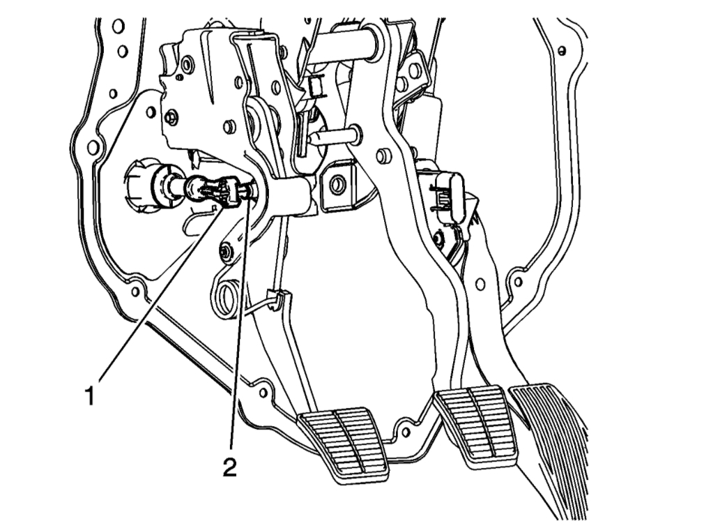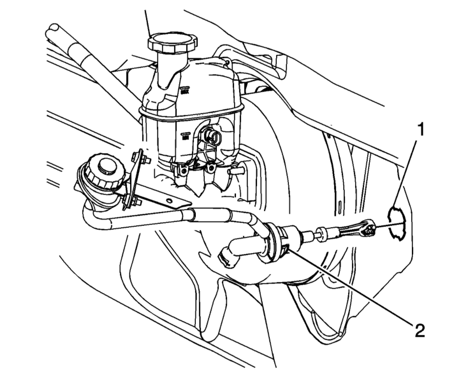 2. Disconnect the clutch master cylinder push rod (1) from the clutch pedal pin (2).
