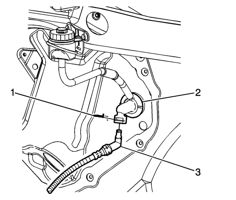 4. Remove the clutch fluid reservoir (1) from the strut tower stud (3).