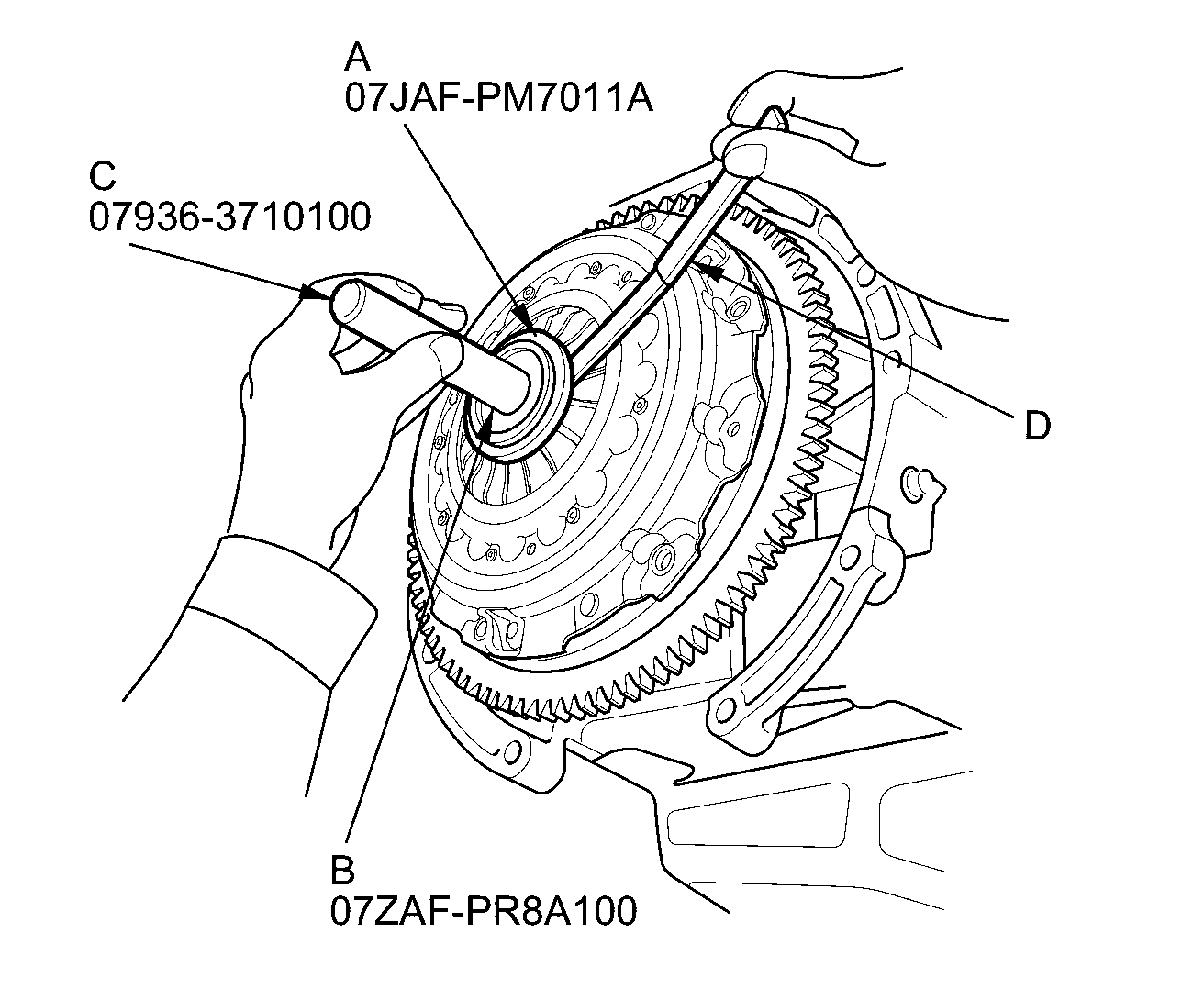 2. Check the evenness of the height of the diaphragm spring fingers using the clutch alignment disc (A), the clutch alignment shaft (B), the remover handle (C), and a feeler gauge (D). If the height difference is more than the service limit, replace the pressure plate.