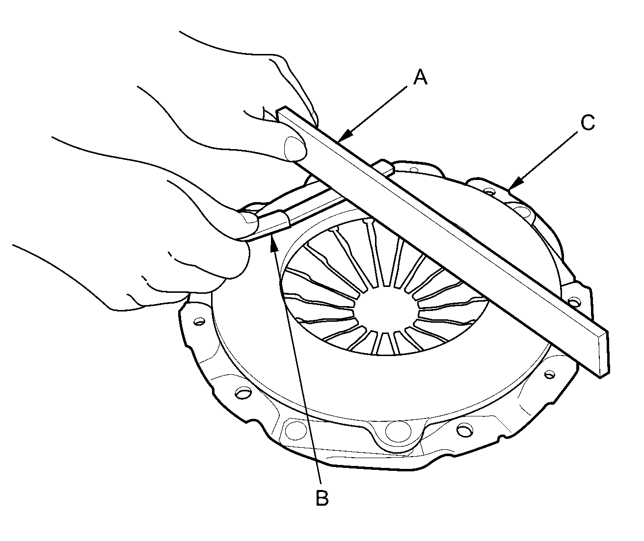 7. Inspect for warpage using a straight edge (A) and a feeler gauge (B). Measure across the pressure plate (C). If the most measurement difference is more than the service limit, replace the pressure plate.
