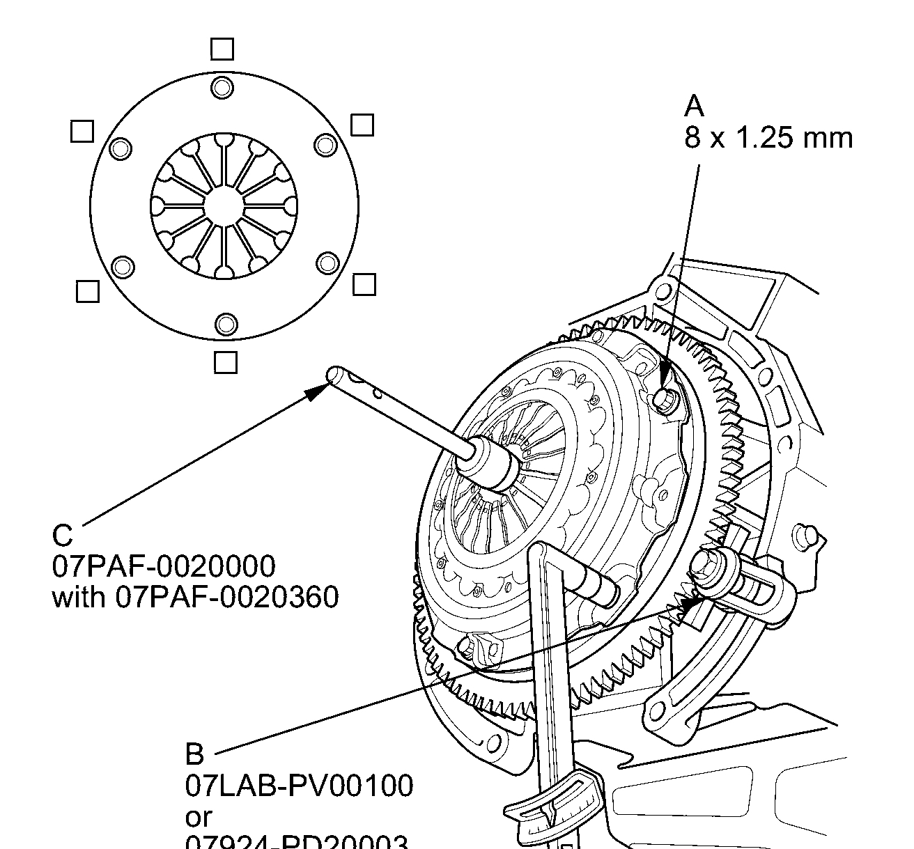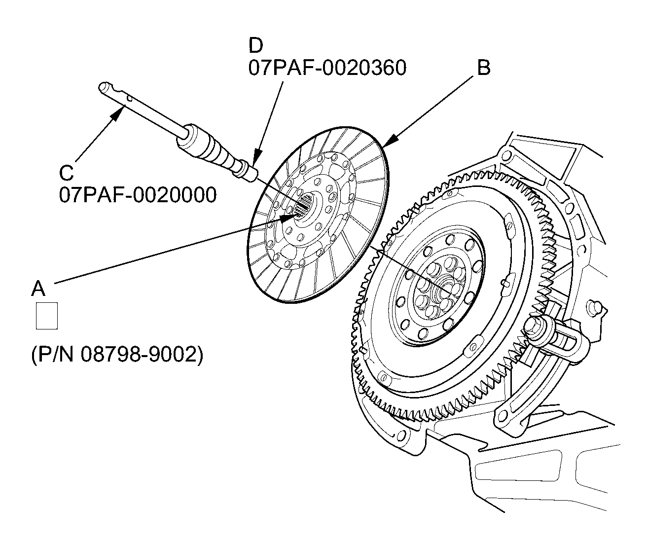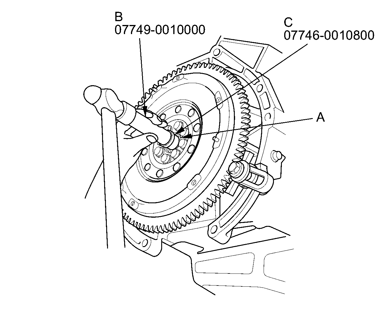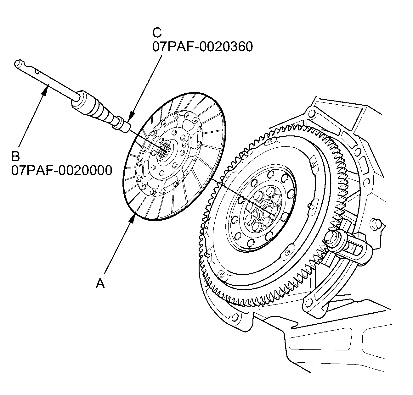 8. Remove the clutch disc (A), the clutch alignment tool set (B), and the 20 mm clutch alignment pilot (C).