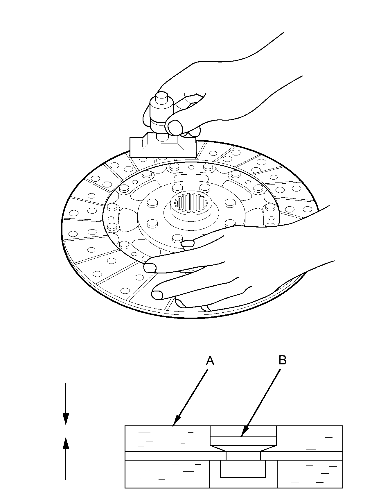 11. Measure the depths of the rivets from the clutch disc lining surface (A) to the rivets (B) on both sides. If the measurement is less than the service limit, replace the clutch disc.
