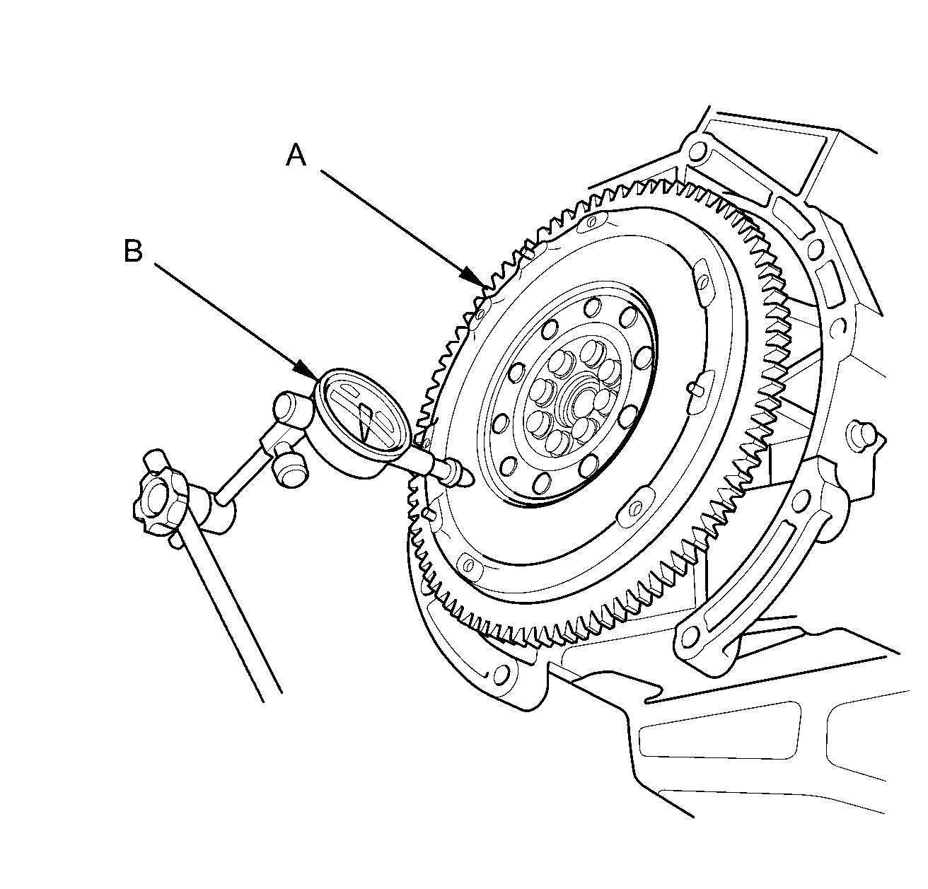 15. Measure the flywheel (A) runout using a dial indicator (B). Through at least two full turns with pushing against the flywheel each time you turn it to take up the crankshaft thrust washer clearance. If the measurement is not within the standard, replace the flywheel, and recheck the runout; go to step 16.