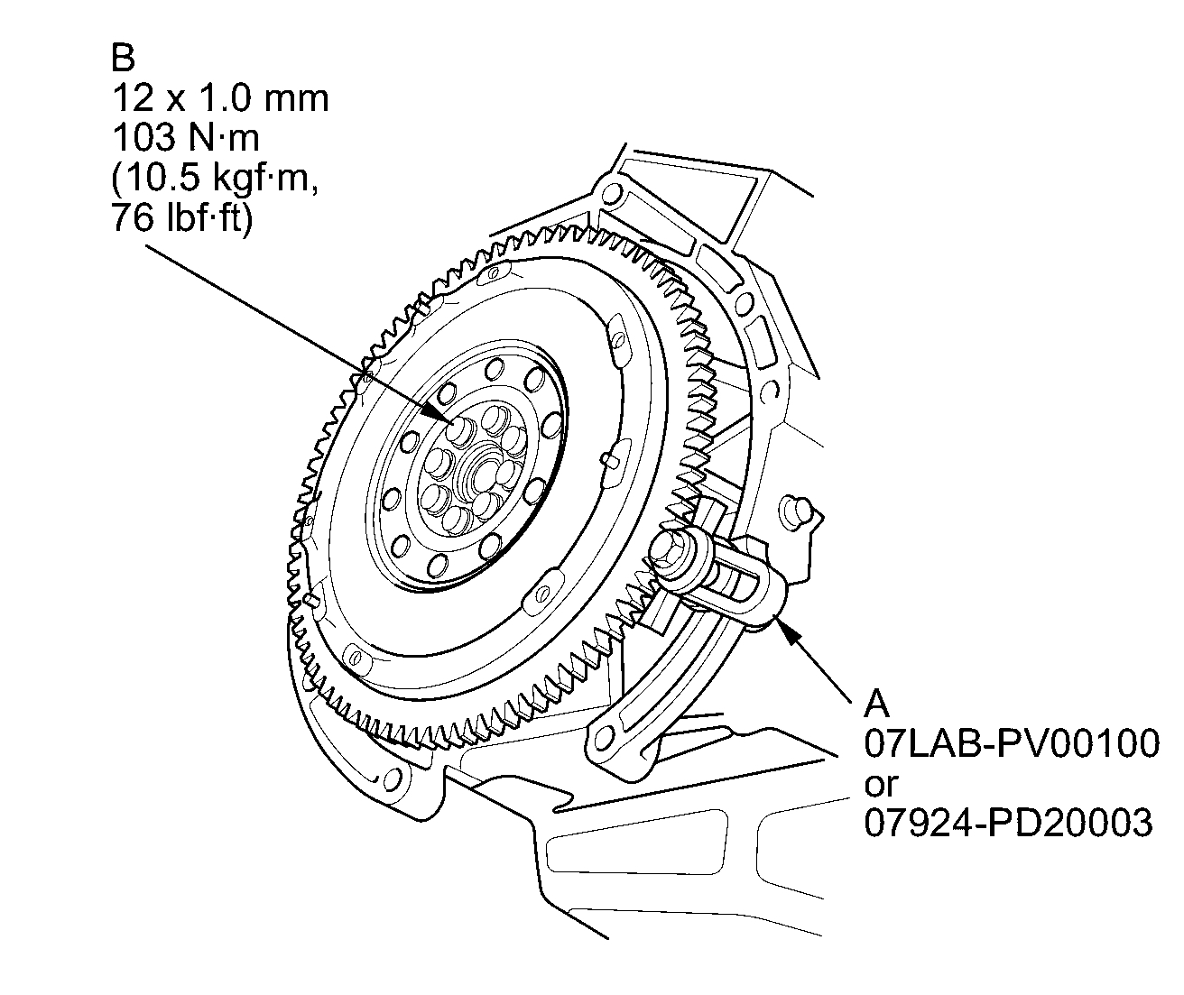 19. Install the ring gear holder (A), then torque the flywheel mounting bolts (B) in a crisscross pattern in several steps.