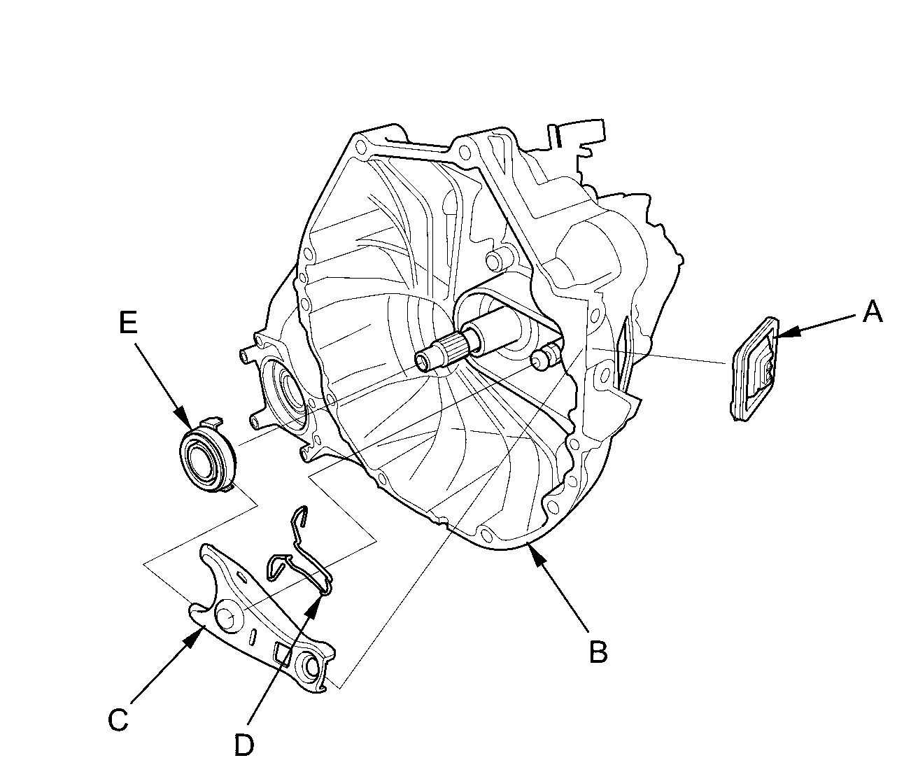 3. Remove the release fork (C) from the clutch housing by squeezing the release fork set spring (D). Remove the release bearing (E).