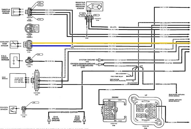 The circuit in question are the wires I highlighted in the last two diagrams. The blue wire is the sensor's ground wire that goes to ground through the computer. From the splice and to the right of the blue section, we don't have to worry about that. The ground wire is shared with the throttle position sensor. If that section had a defect, you'd be getting a fault code for the TPS too.