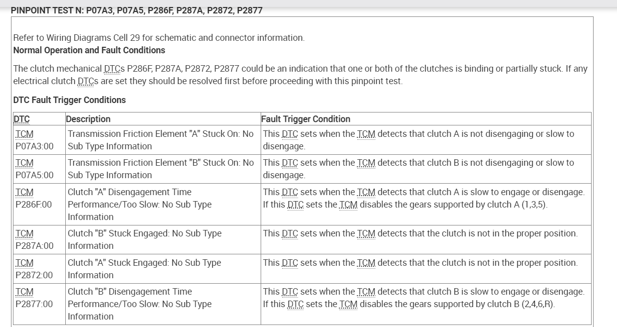 The clutch mechanical DTCs P286F, P287A, P2872, P2877 could be an indication that one or both of the clutches is binding or partially stuck. If any electrical clutch DTCs are set, they should be resolved first before proceeding with this pinpoint test.