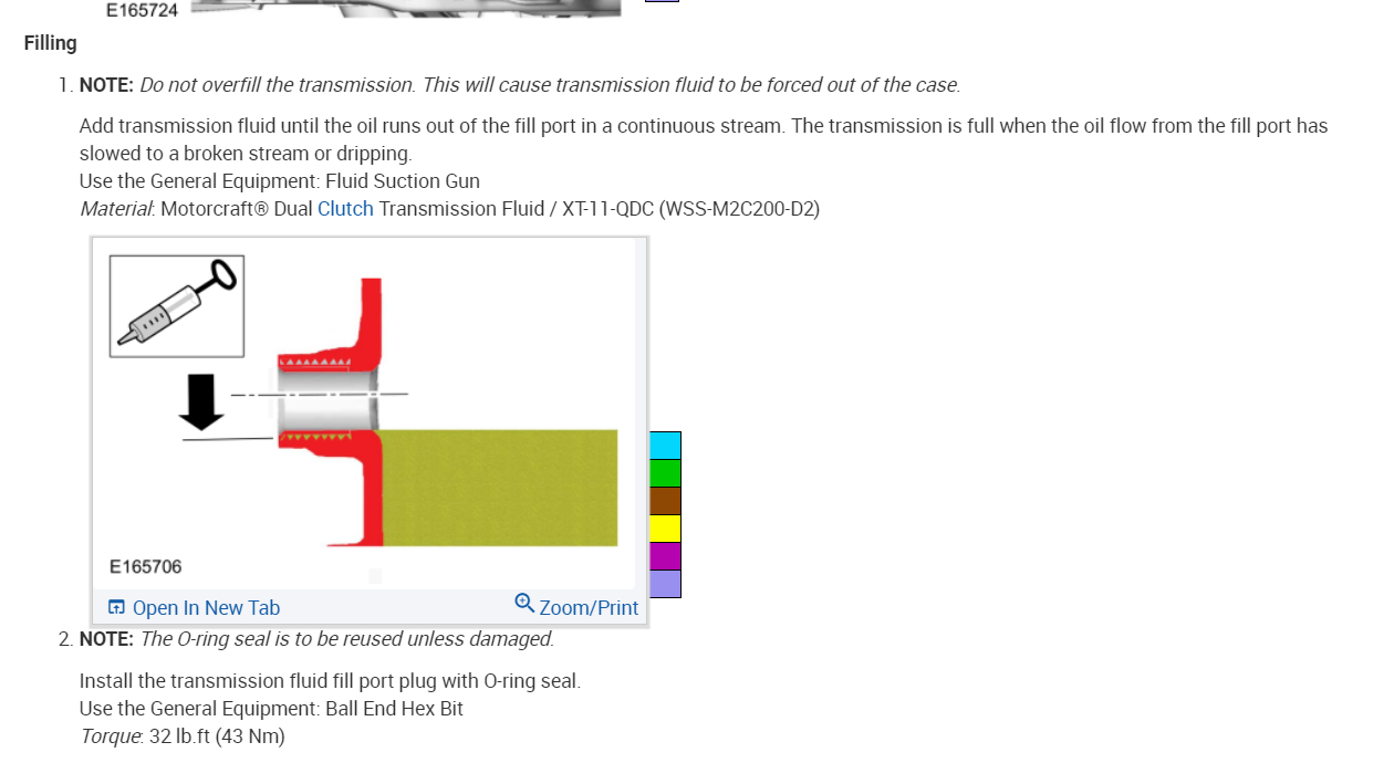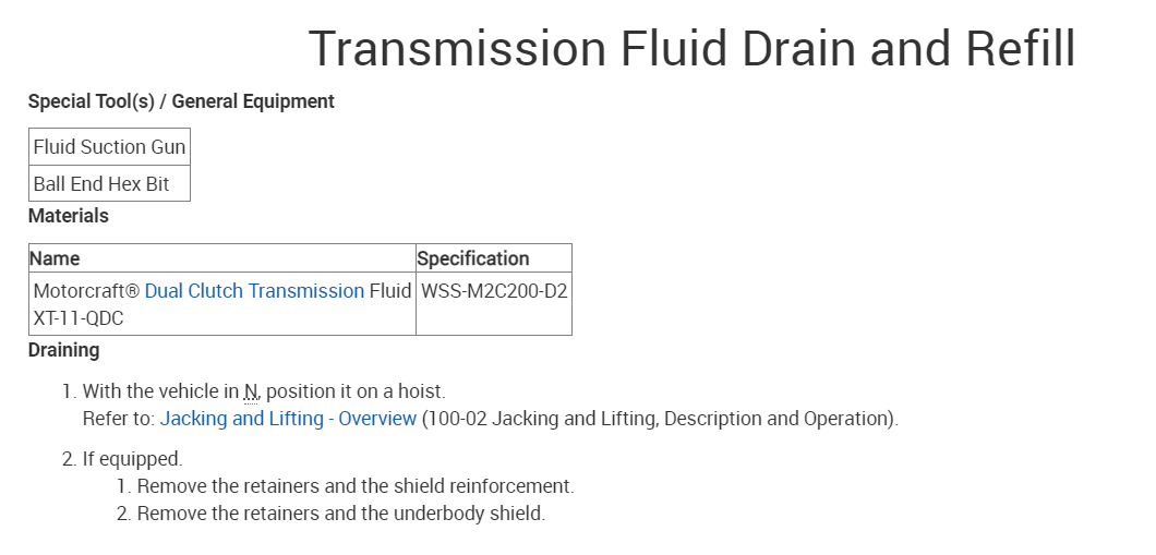 * Automatic transmissions that require Motorcraft Dual Clutch Transmission Fluid should only use Motorcraft Dual Clutch Transmission Fluid. Refer to scheduled maintenance to determine the correct service interval. Use of any fluid other than the recommended fluid may cause transmission damage.