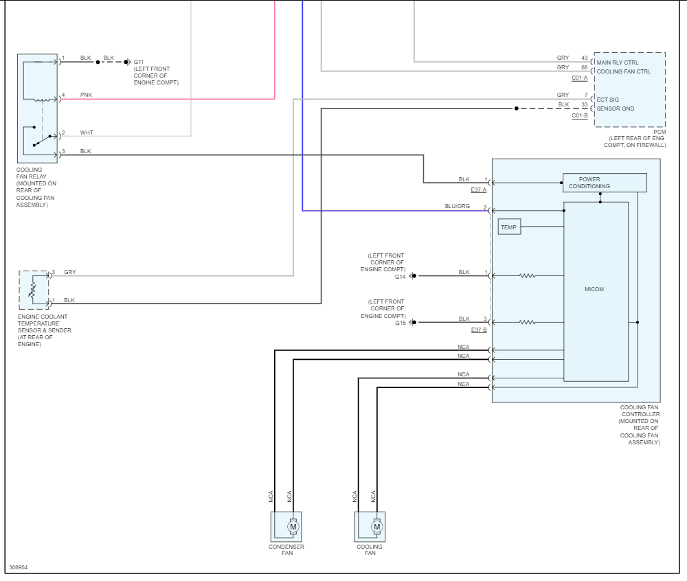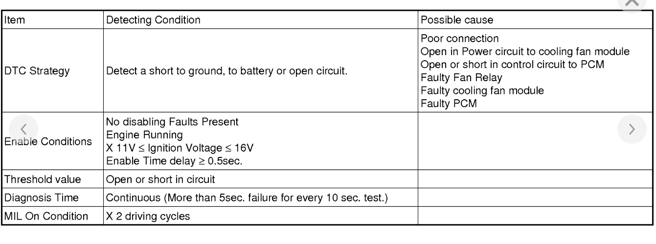 Checking PWM signals to cooling fan under detecting condition, if the PCM detects short to ground, to battery or open circuit, PCM sets P0480. MIL (Malfunction Indication Lamp) turns on when the malfunction lasts until consecutive two driving cycle.