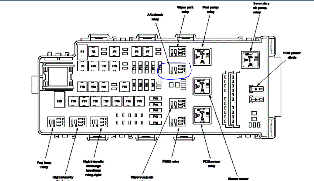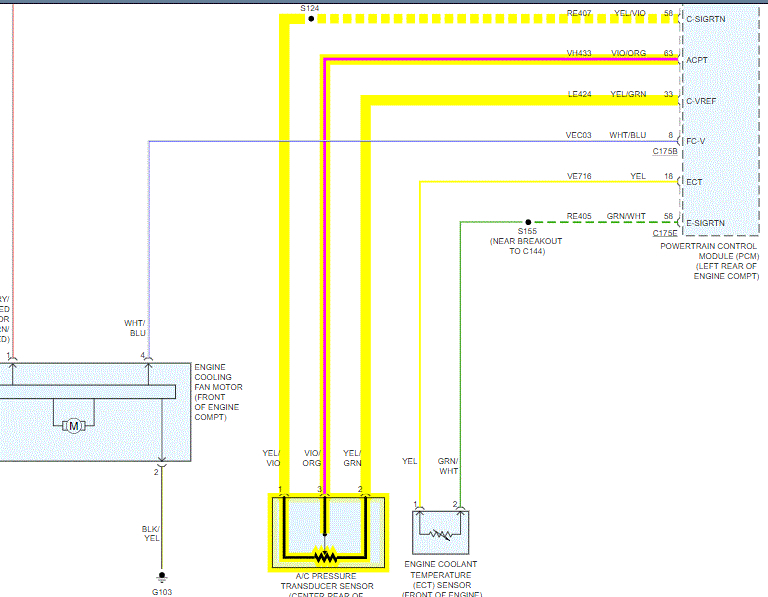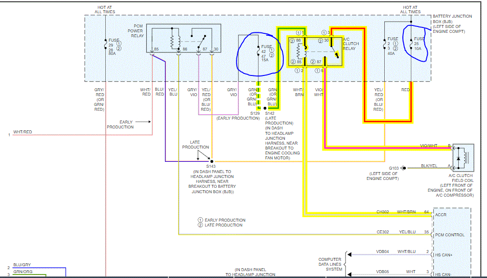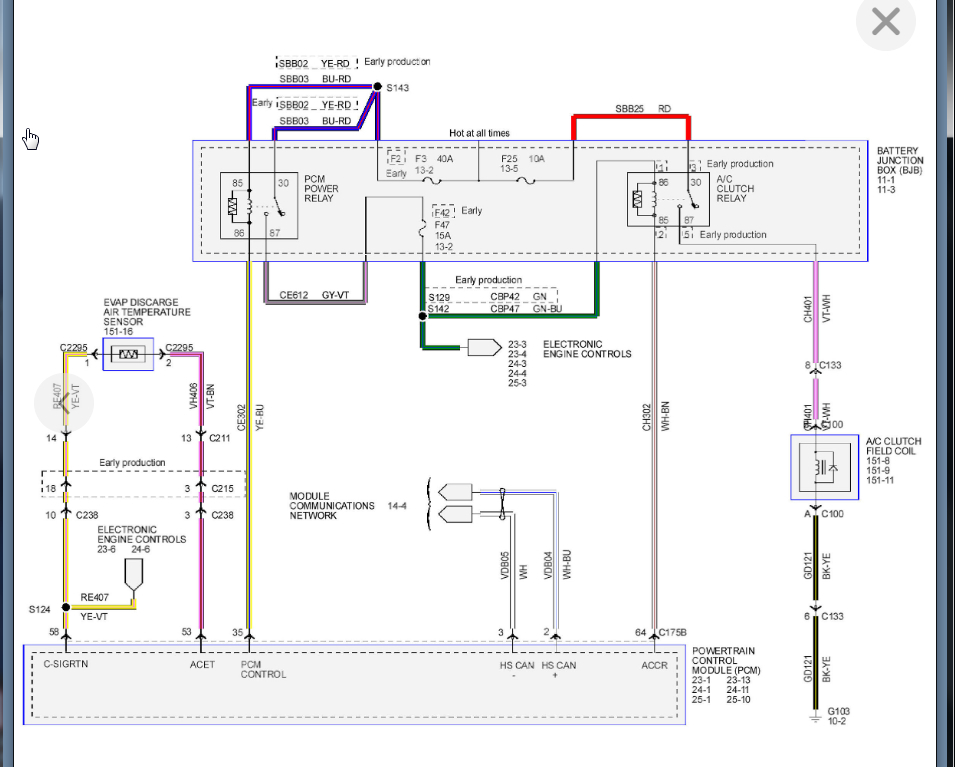 Next we need to check power at the compressor to see if it is correct. I attached a wiring diagram that shows the circuit. As you can see we need to go to the battery junction box and look at fuse F3 and F25 if you have no power. Then we need to remove the AC clutch relay and jump 86 to 87 and see if the compressor kicks on. If it does, swap the relay with another. If that doesn't fix it we need to look at the control side as it is most likely not being "told" to come on by the PCM. Either due to the PCM being faulty or an input sensor causing it to not command it on.
