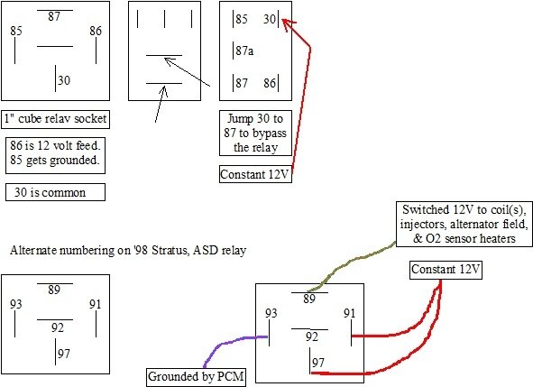 I'm including a drawing I made of the most common relay terminals. The upper left one is the easiest to find in any salvage yard. You can use universal crimp-type terminals, and let the relay hang by the wires. There are also aftermarket versions with a mounting tab built into the relay's cover.