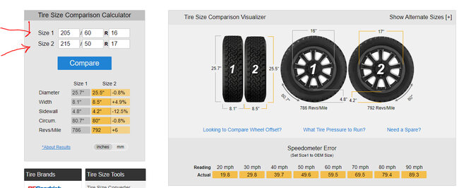The site shows the differences in diameter, sidewall height, width, and even how many revolutions each tire goes through in a mile. If you look below, I attached what I found on the two tires you mentioned. (See pic 1)