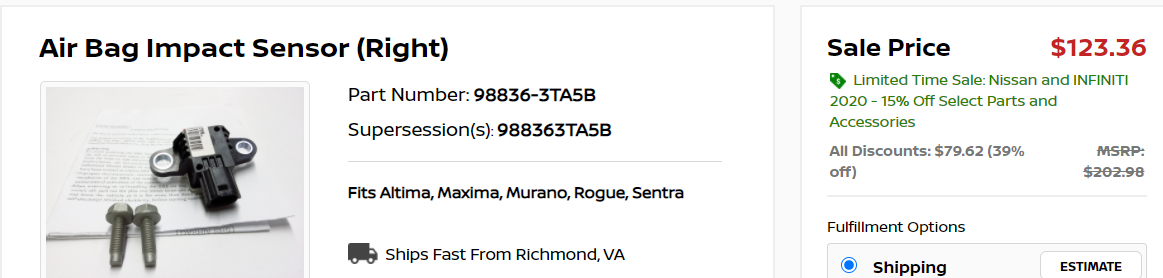 I took my car to the dealership to figure out what the issue was. They told me I needed to replace the passenger seat back airbag sensor. This part number 87600-3TA0H is what I was told needs replaced. That part number is the entire back of the seat that the dealer wants over $1,000.00 for.
