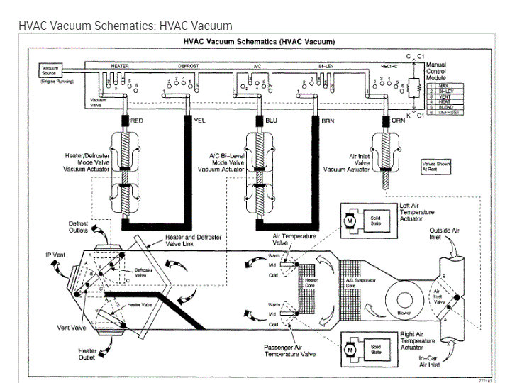 First, I attached the vacuum schematics below for your review. Take a look through them and let me know if they help. Also, note that the HVAC system uses an engine vacuum to control the mode doors and other air flow components. (Pic 3)