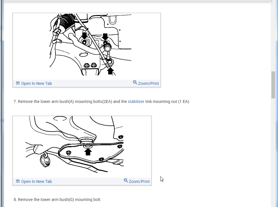7. Remove the lower arm bush(A) mounting bolts(2EA) and the stabilizer link mounting nut (1 EA).