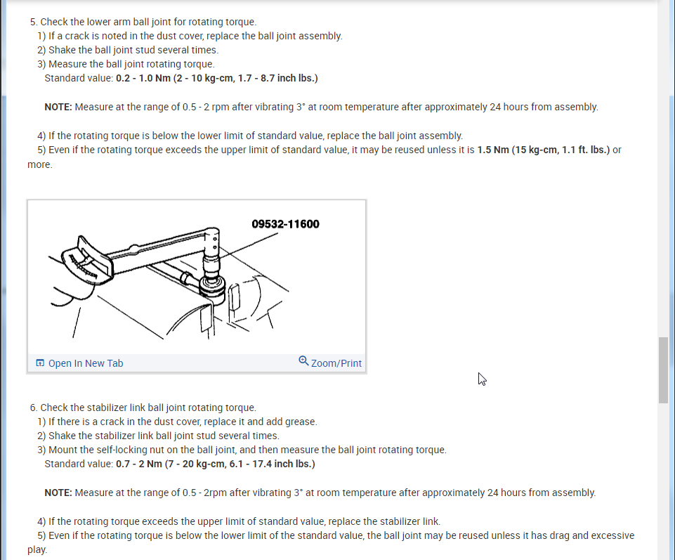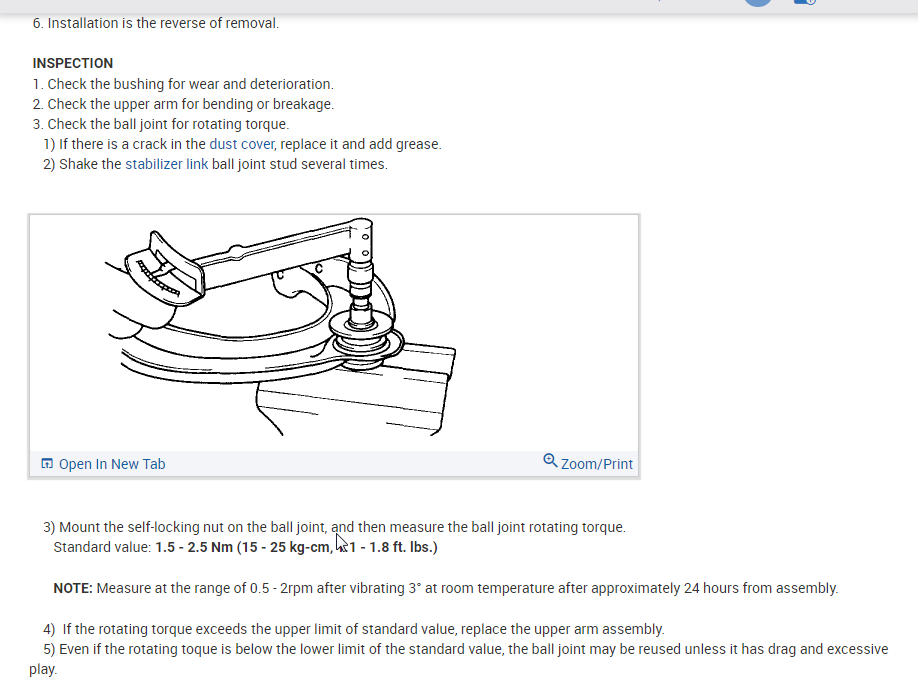 5) Even if the rotating torque is below the lower limit of the standard value, the ball joint may be reused unless it has drag and excessive play.