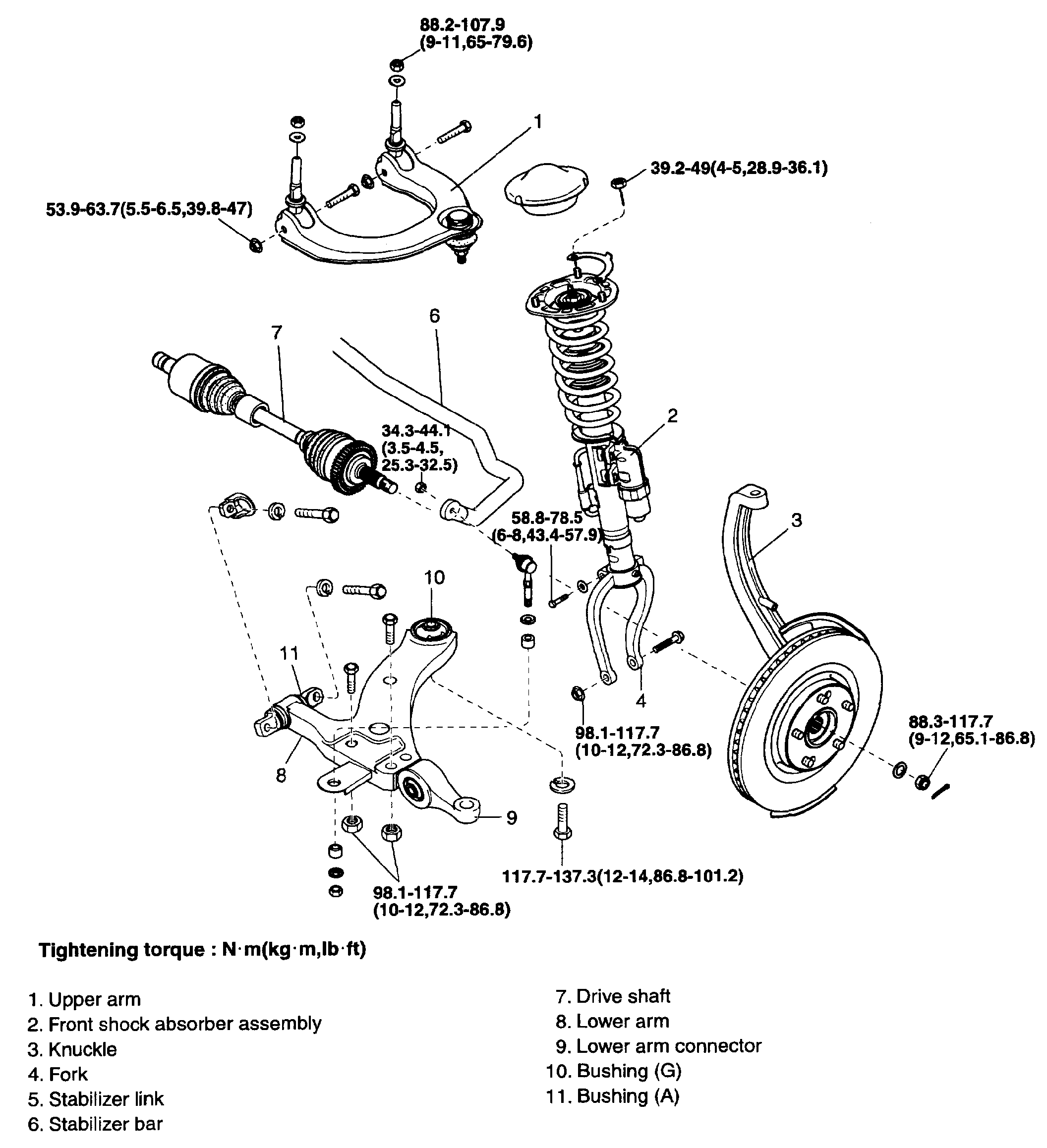 2. Align the lower arm bushing(G) as the angle indicated in the illustration.