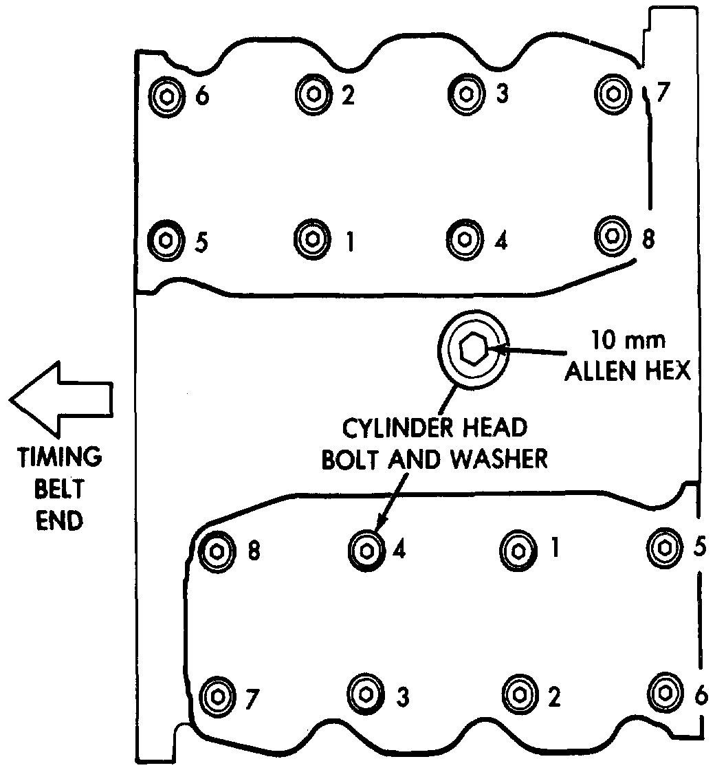 4. Tighten bolts in the order. When tightening the cylinder head bolts, tighten gradually, working in two or three steps and finally tighten to specified torque of 108 Nm (80 ft. lbs.).