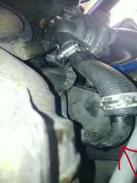 I managed to get the photo to upload. The water pump is visible above. The coolant hose that leads to the oil cooler connects to a hard line that is before the oil cooler. I can't tell where that line goes but it doesn't immediately go to the oil cooler as far as I tell. I drew an arrow approximately where the leak is. It's a drip with reservoir cap on, but it's a stream with the cap off. I'm wondering about the name of the part to be able to replace it. I'm also wondering if it can be patched with some sort of wrap or jb weld.