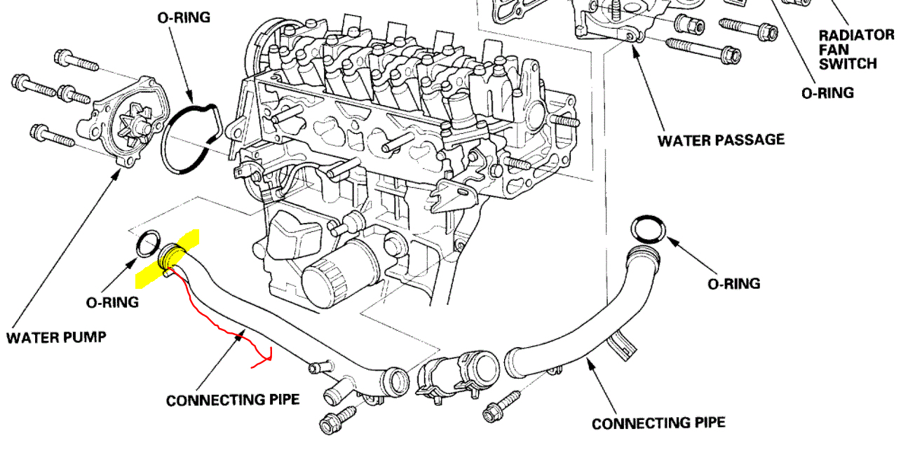 Hi, my car is leaking or I should say seeping/slow leak. I have added no coolant. When I look at the motor from the driver's side. I see a small coolant leak. I know there is a weep hole on the pump. There is also a coolant pipe that goes underneath the intake from the back of the water pump housing to the thermostat. On the water pump side, the pipe is sealed with an o-ring. No disrespect. I'm not talking about the water pump rubber seal/gasket. You can see the pipe I'm speaking of in the exploded view. Can that run down or maybe I should say. Is it a known problem to leak and run on top of the water pump weep hole? It's snowing and brutally cold right now. I mainly ask because the mechanic says he needs to take the cover off to see the leak. I want to know before and not be obligated to a costly repair. T/belt with pump service done 3 years and only 8,000 miles. Am I wrong to think the way I do? One more question the Honda service manual says it's normal for the weep hole to seep. What is considered normal? As I wrote earlier I've added no coolant slight stain on cover also no noises at all. Thanks, any help or suggestions is appreciated. Neil