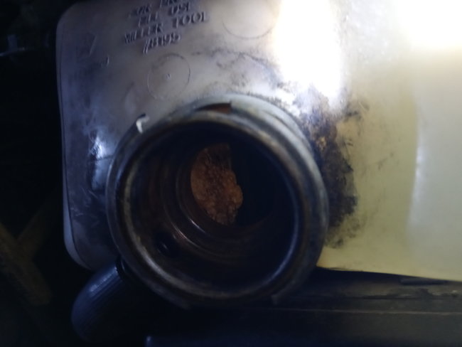 Vehicle at traffic light protruding from under/coolant on the ground extending from front driver side to the next lane. I noticed smoke from hood of car. No overheating report. Some fluid remains in overflow. Car will start. Overflow is melted inside and where the cap goes on is crooked.