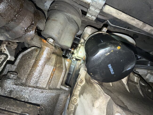 As far as I can tell, my car does not leak coolant while the car is off, but once I turn it on it begins to leak coolant. It seems to only leak when the reservoir is filled and leaks until the reservoir is empty. I say this because the car does not overheat, so I assume there is still some coolant in the system. The leak is coming from beneath the car close to the oil filter. I have attached a video of the location of the leak. Can you help me fix this leak? I am not sure exactly what needs to be replaced/repaired.