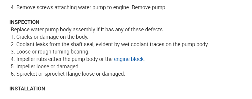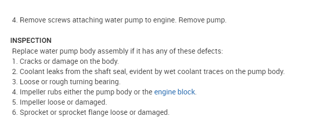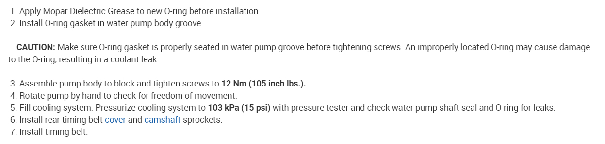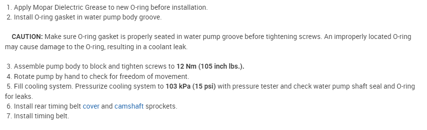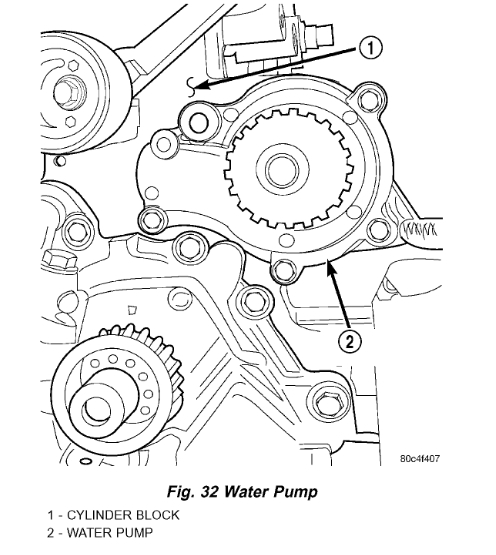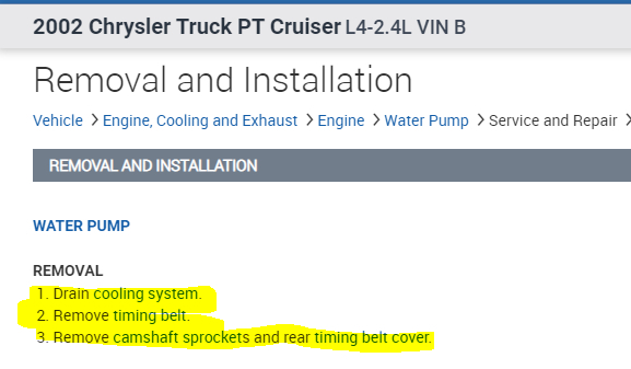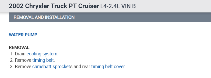 To replace the water pump on this vehicle, you need to remove the timing belt. There are several steps to this and other steps that will need to be taken. I will attach all of them below. Note: The first 6 pics are the actual directions for the pump itself. The remaining pics are the directions related to removing the timing belt, removing the rear belt cover and cam gears, draining the coolant, and so on.
