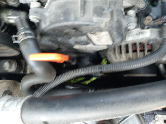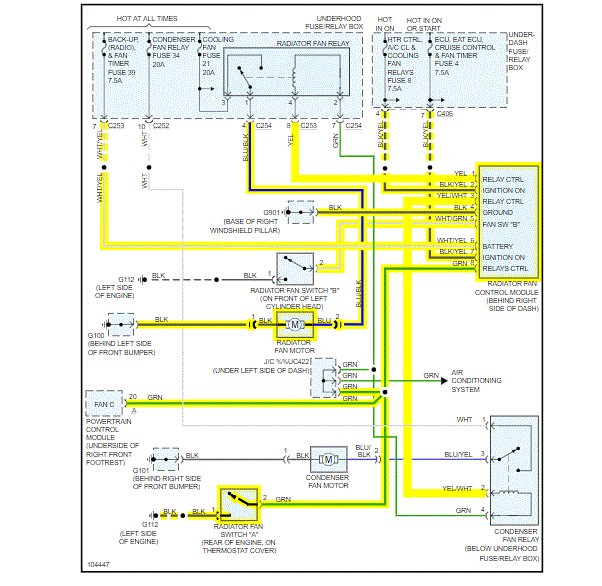 Why did the radiator fan not come on? I begin to look for leaks or problems around the entire radiator, hoses and engine. I did not see any except the white spots scattered on or near the hose, possibly coolant stains from the radiator. With the engine running and ac at max, I placed a cardboard layer under the engine and checked for leaks. On the drivers side underneath the engine, I began to see water dripping continuously onto the cardboard. I could not see where precisely the water was coming from. I was wondering if it was coming from the water pump, A/C condenser or a leak in that small area. The radiator fan never comes on. The A/C cooling fan turned off when I turned the A/C off. I captured a quick video of the water dripping underneath the passenger side of the engine, the fans, engine and no smoke coming from the tailpipe. During my 5 minute inspection, the engine ran smooth at normal temperature during the whole time. Is it the radiator fan, the water pump, radiator cap or what and where is that dripping water coming from? It stopped dripping when I turned off the A/C.