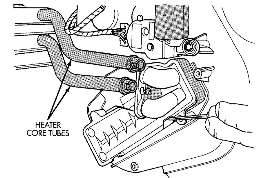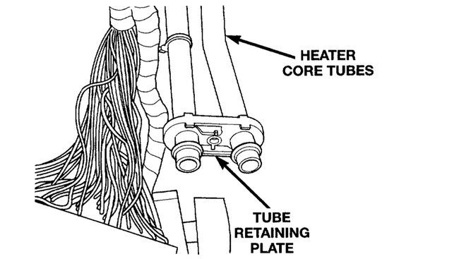 8. Remove heater core cover. Insert a small amount of towels under the heater core tubes. Remove heater core plate and tubes.