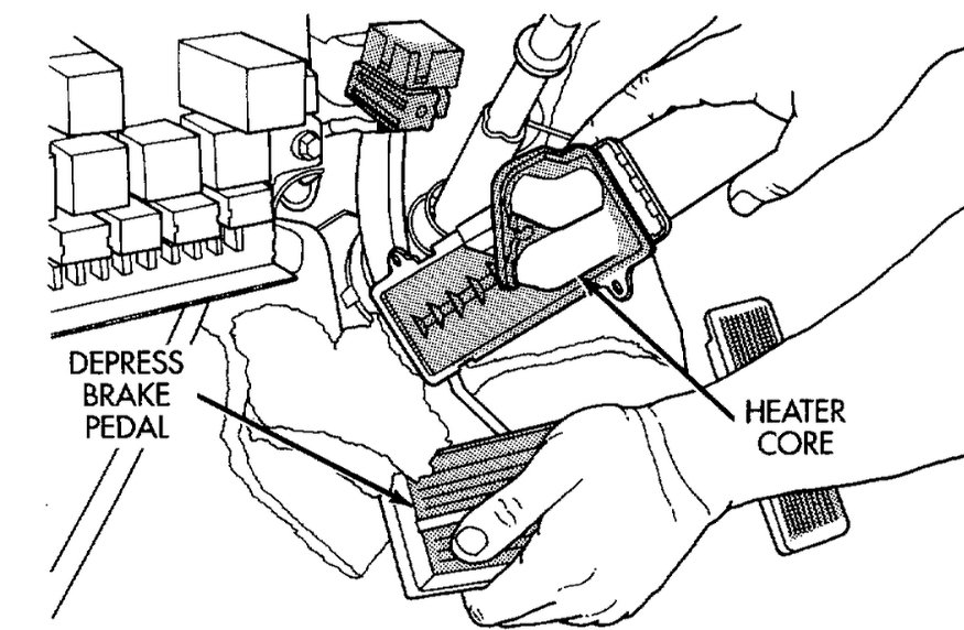 11. Depress brake pedal and remove heater core from HVAC housing.