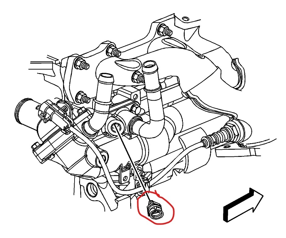 It is tucked into the thermostat housing on the back side of the engine. Look where the coolant lines connect to the housing, the sensor is between them. If you are replacing it, drain the coolant down, then remove the sensor, apply sealer to the replacement and tighten to 15 lb ft, it is tapered so be careful as the housings crack very easily.