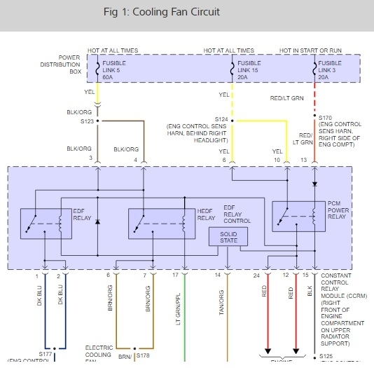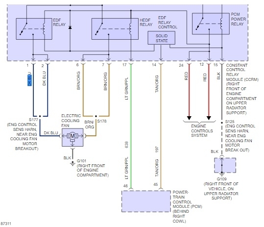 To test the relays themselves you need to connect a wire to ground and use a probe on the other end to probe the back of pins 14 and 17. Those are the two ground pins the PCM uses to turn on the fans high (17) and low(14) speeds. If you apply ground to pin 17 you should get battery voltage at the brown with orange stripe wire at the fan.