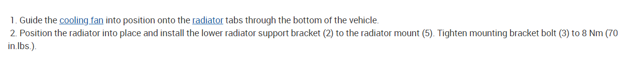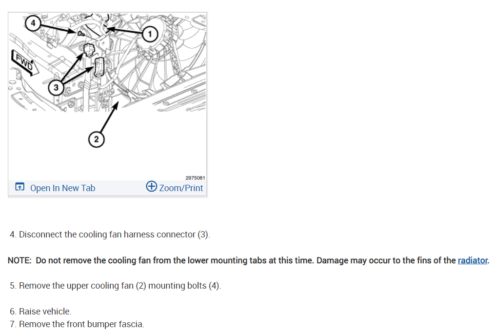 The radiator does not need to be removed but it does need to be loosened from its mounts. Also, the front fascia and bumper cover will need to be removed. I would start by disconnecting the battery. Here are the instructions on how to replace the radiator cooling fan. Check out the images (below). Let us know how it goes.