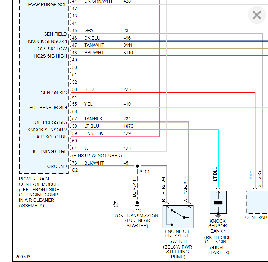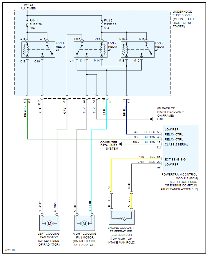 Yeah, it had 2 codes; P0128 and P1258. I initially checked the codes, cleared them with my actron:cp9575 code reader, started the car and watched live data on the temp sensor go from 180 to 228 F - that took 15 to 25 minutes with the hood up. No low speed or high speed fan at any temp. 2 hours later and car cooled down I turned on the separate AC button at 195-198F the left fan(Passenger side) ran on high for a only a few minutes then went into low speed, while the right fan(driver side) ran slower never high, after seeing your schematic it looks like there must be a dual windings on 1 fan motor(for 2 speed operation) while the other fan is a single speed. After a long time to get the temp up to 228-230F only both fans ran on low speed, never got a hi speed again. Shut down the car and let cool. All 3 fan relays check fine with hot wired the coils and ohmed the contacts, ohms seemed good not like dirty contacts and high ohm reading. So the fact that I got temperature in Fahrenheit from the PCM on my scanner should seem to tell me the temp switch/sensor was talking to the PCM. I got a 40 step instructions from a buddy off Alldata but I need a scan tool to now go further.I couldn't find the diagram on this lacrosse only other Buick which I could see were not the proper ones for this car, so thank you for that now I gotta see if there is any way without the scan tool to use a meter, test lite, jumpers, etc to keep going. I wonder if the pcm ground is it's metal housing and a corroded bolt, or gonna be a separate wire/group of wires under the dash or in the engine compartment to see if it's a ground issue, other wise it's going to be the darn PCM? Okay, where's the PCM at? Lol. Dash or engine bay?