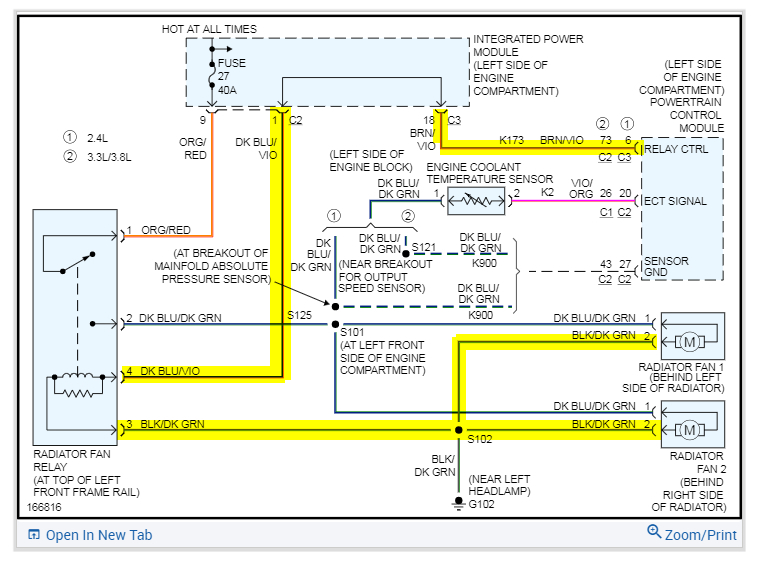 I found radiator cooling fan not running but both fans running when I turn on air condition. I have OBDII sensor can see engine coolant temperature.